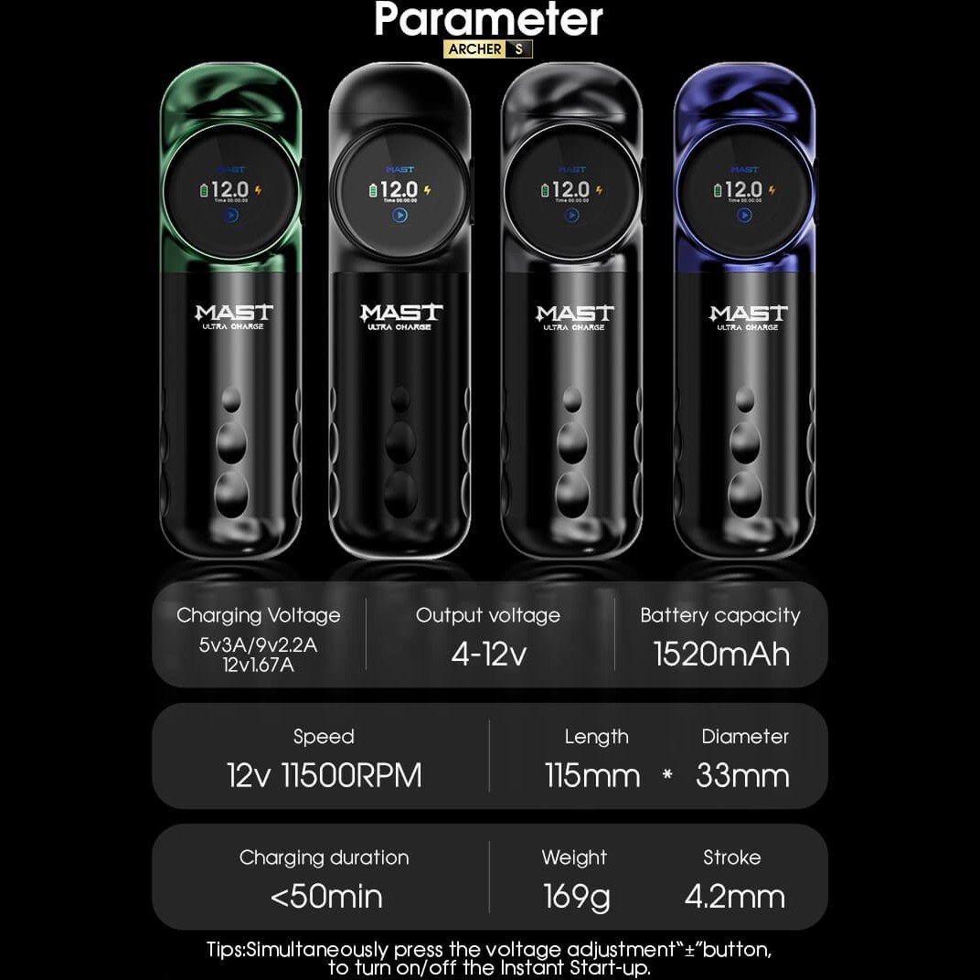 دستگاه تاتو پن مست آرچر اس (S Mast Archer) یک دستگاه تاتو پن بی سیم با موتور قدرتمند و بدنه سبک و ارگونومیک است که برای تاتوکاران حرفهای و مبتدی به یک اندازه مناسب است.