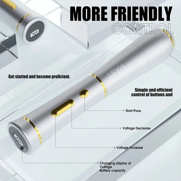 ولتاژ کاری بین 4 تا 10 ولت قابل تغییر است، که به تاتوکار اجازه میدهد برای انواع پوست و تکنیکهای مختلف تنظیمات مناسب را انتخاب کند. - سبک و خوشدست: